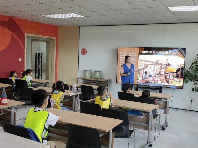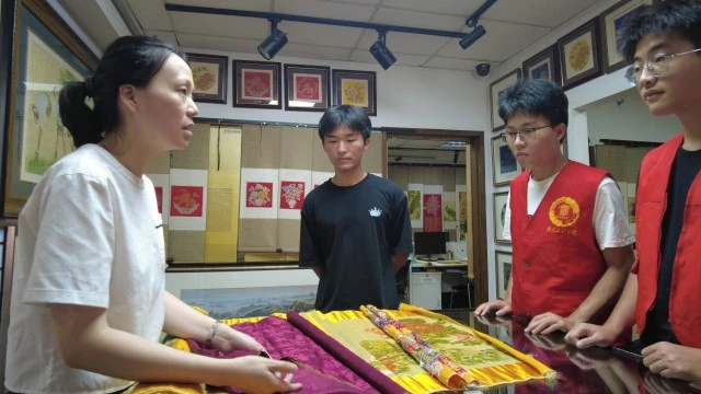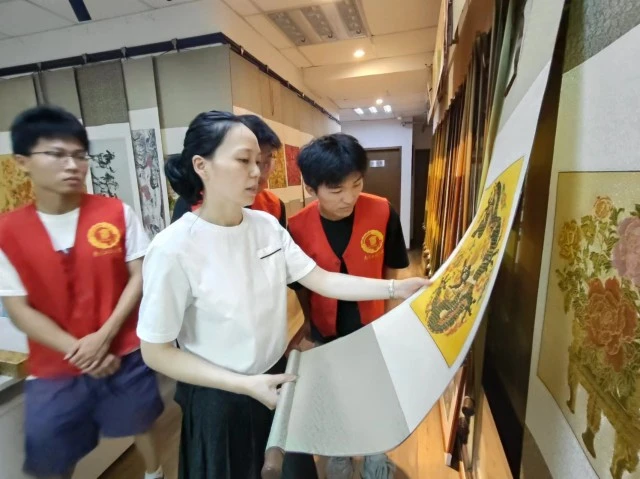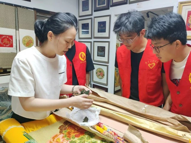 南京云锦宜贡坊作为云锦生产厂家之一,将传统文化与现代科技相融合,让云锦焕发出无穷的魅力。一踏入云锦宜贡坊,成员们便被眼前华美壮观的云锦制品所吸引。从精美的龙袍、凤袍到各式各样的云锦围巾、手袋,传统美感和现代产品的实用性相融合,既保留了云锦的传统魅力,又赋予了它现代的活力。在讲解员的带领下,成员们详细了解了现代云锦产品的制作过程,包括绞丝、筒子络丝、单丝打捻、并丝、复捻等复杂工序,以及最为关键的“挑花结本”技艺。通过参观学习,团队成员深入了解传统文化,感受到非遗文化的无穷魅力,他们纷纷表示,定要学好科技文化知识,用科技赋能文化传承,以行动弘扬中华优秀传统文化。