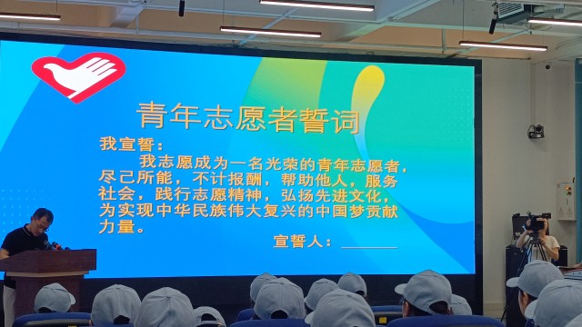 会议第二项由志愿者代表宋宜展、揭锡磊领誓,全体志愿者进行宣誓,