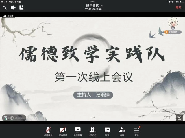 调研初期,实践队队长组织队内成员召开儒德致学实践队线上会议,张雨婷通过分析儒家文化和人才教育的时代意义清晰此次社会实践意义,队员踊跃发言、各抒己见,分享各自对儒家文化与教育强国关系的见解。会议最后,队长张雨婷对下一步的实践工作进行了部署,明确了各队员的任务分工,并鼓励大家齐心协力,深入探索儒家文化与教育强国的有效结合路径,为推动我国教育事业的发展贡献力量。