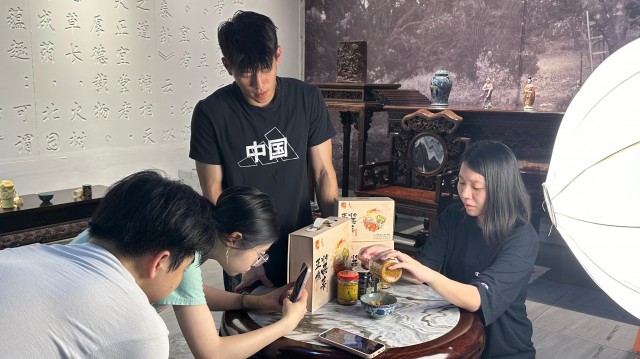 图为实践队员正在拍摄增城迟菜心酱推广短视频