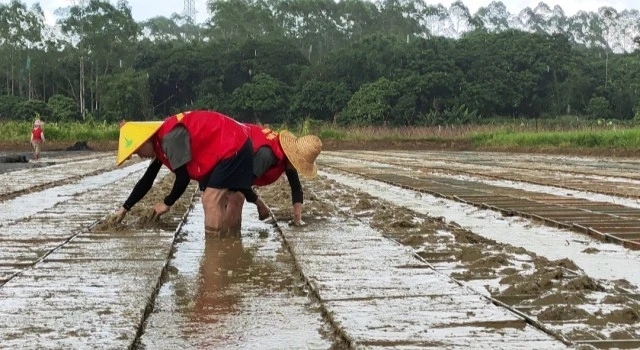 7月17日,在指导老师陈金苗的组织下,实践队员身着统一的队服,装备齐全,手持农具,走进田间地头,分工明确,有的撒播育苗,确保播种均匀;有的奋力翻刨泥土,为作物根系创造良好生长条件;有的则手持无人机,更精准定位作业区;同时,还有队员负责铺设黑色保护网……各施其职,投入到紧张有序的农作活动中。烈日炎炎下对大学生的体力和毅力都是双重考验,即便如此,整个实践过程中,队员们齐心协力,协同配合,确保各项工作顺利进行。