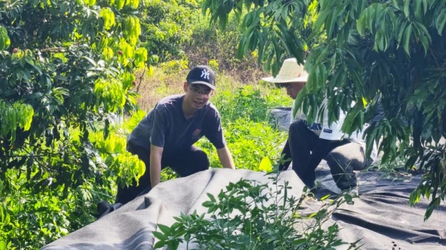 为保护荔枝的生长环境,夏日炎炎,广州市正旭农业科技有限公司董事长助理陈麟舼和广州市得田农业科技发展有限公司执行董事陈艺瑜及“助农为乐”实践团不畏酷暑,深入腊圃村正旭现代农业孵化园荔枝种植基地,开展实践活动,为荔枝园铺盖地膜。