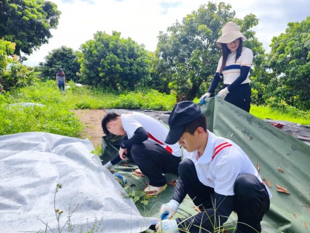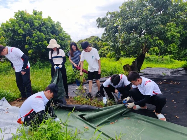为避免荔枝园杂草对荔枝生长的危害程度,“助农为乐”实践团在广东省农业科学院植物保护研究所郭义博士团队的指导下,团队积极响应采用生物防治方法,以实现荔枝园“以草治草”的目标,减少除草剂的使用。荔枝园杂草管理的传统方法:人工铲除和喷施化学除草剂会导致果园水土流失,土壤表面因无遮挡导致温度过高,影响荔枝根系的活动从而影响植株的生长。因此,提倡铺盖地膜及定期人工除杂草的管理方法。