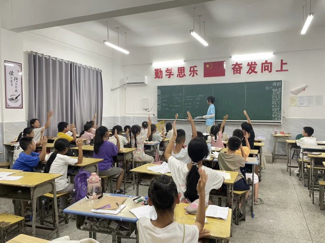 图为四年级老师李亚男在为同学们讲解英语。大学生网报通讯员何宇佳供图