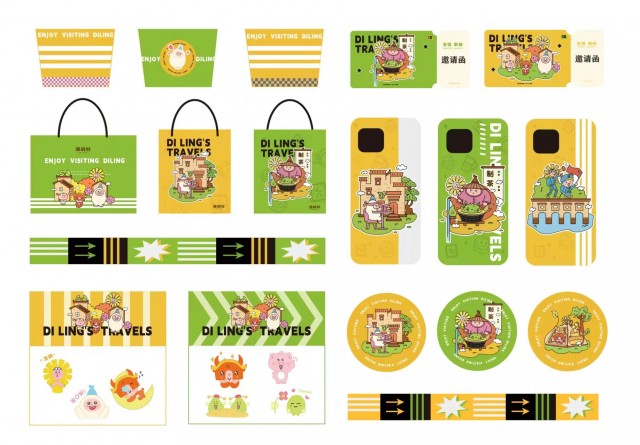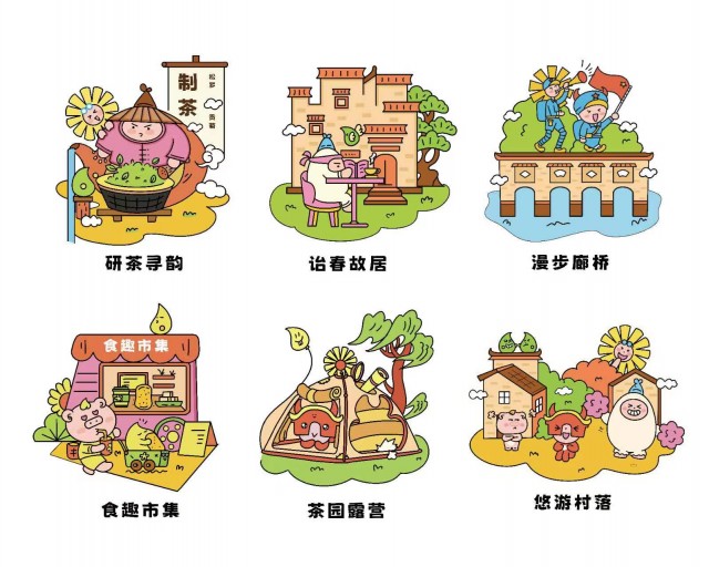 团队其中之一以休宁县迪岭村为主题,通过前期实地调研,对迪岭村的“历史文化、特色物产、自然景观”进行了解。基于前期调研,为迪岭村打造一个独具特色的文旅品牌,品牌的IP 设计灵感来源于迪岭村当地的特色历史建筑:拱北廊桥;以及特色物产:贡菊、松萝茶、毛豆腐和花猪。整体风格比较有趣,给人亲切的感觉。同时,我们还以品牌 IP为导向,进行场景设计,延展了系列插画海报。同时还针对迪岭村的地形图进行插画设计,地图标注了迪岭村的主要景点、交通线路等信息,为游客提供了旅游服务。最后进行文创产品延展,从精美的摆件到实用的生活用品,每一件文创产品都承载着迪岭村的独特韵味。