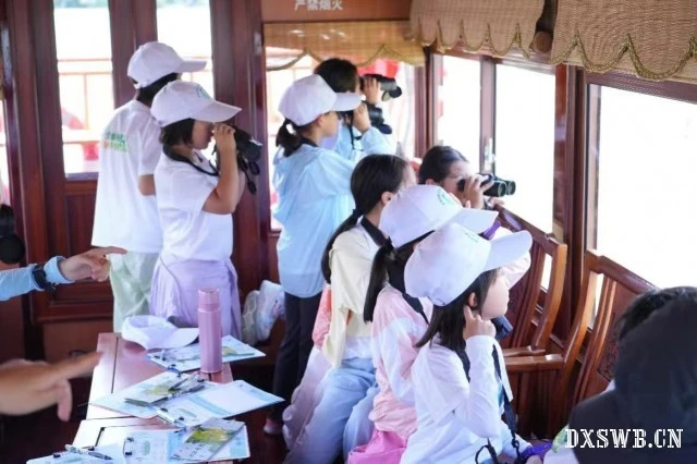 随后大家排队有序进入游船,随着游船轻轻划破西湖宁静的水面,一场关于鸟类世界的探索之旅悄然开始。湖面上,波光粼粼,微风拂面,带来了阵阵凉爽与清新的空气。孩子们手持望远镜,紧盯着前方的鸟岛,心中充满了期待。
