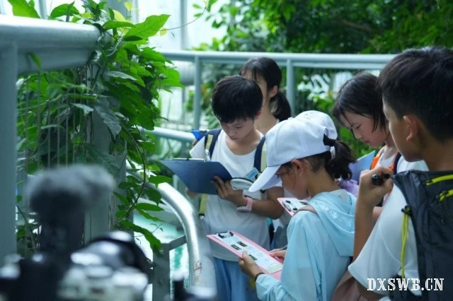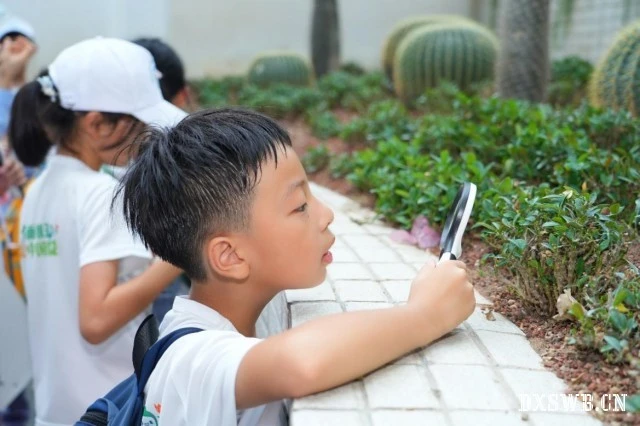 随着指导老师的一声令下,营员们分组行动,迅速融入了惠州植物园的广袤绿意之中。植物园内,种类繁多的植物争奇斗艳,从古老的蕨类植物到现代园艺的杰作,每一株都承载着大自然的智慧与生命的奥秘。营员们在完成任务卡的途中,见到了望天树的高大挺拔、黑桫椤的古老历史、冬青的繁多种类……他们或低头观察,或相互讨论,不时还用电话手表拍下这些绿色的伙伴,记录下自己的所见所感。