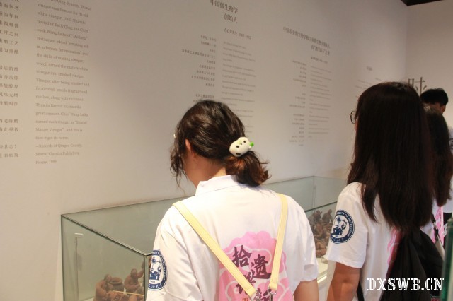 拾遗谱新实践队队员参观了美和居老陈醋的酿制过程,以及美和居老陈醋在日常饮食,保健食品等中广泛的应用。实践队队员了解到美和居老陈醋酿制技艺,是由创始人在前人酿醋的基础上,创新发明了“蒸、酵、熏、淋、夏伏晒、冬捞冰”的酿醋密法。这种方法一改过去几千年白醋尖酸寡淡的口感,使得醋色黑紫,绵滑酸爽,香甜劲透。山西老陈醋因此进入了黑色陈醋时代,美和居老陈醋成为了东方谷物熏醋的开山鼻祖,独步东方谷物醋的巅峰之域。