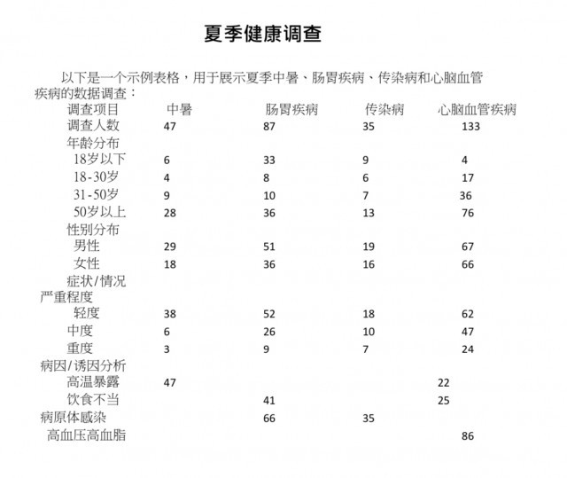 经过详尽的调查数据分析,我们发现,在炎炎夏日,高温与多雨的气候特征使得中暑和肠胃疾病成为了该村暑假期间最为突出的健康问题。更值得一提的是,随着蚊虫的繁衍增长,通过其叮咬传播的疾病,如登革热、乙脑等,也逐渐展现出不容忽视的发病态势。这些详尽的数据为我们接下来制定更加精准有效的健康干预措施提供了坚实有力的支撑。具体数据如下: