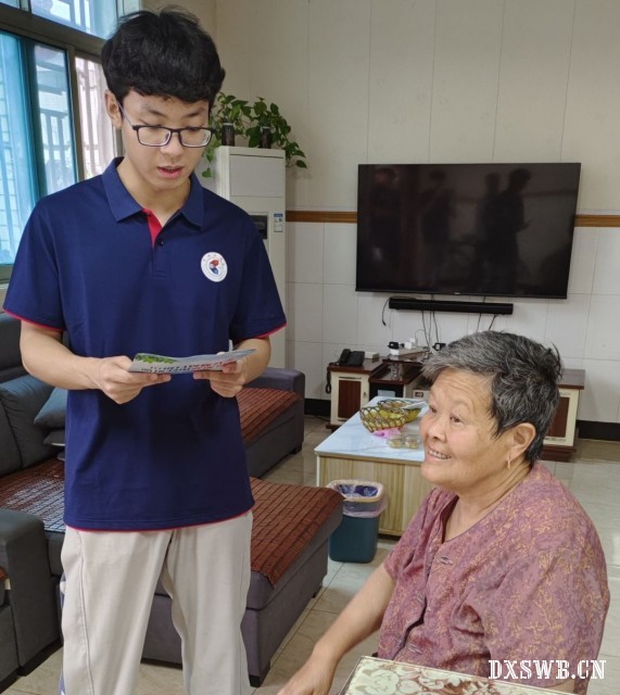 图为小组成员李阳在居民家中为老奶奶宣传垃圾分类有关知识。郭新成供图