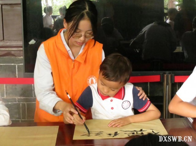 在登山的过程中,孩子们逢联必诵,志愿者们在相应的楹联前为孩子们讲解其含义与知识背景,孩子们在志愿者的介绍下更加懂得了楹联文化的意义。清凉台上,孩子们跟随志愿者张国燕的脚步,参观朱德故居。随后,孩子们在故居大厅摆放笔墨,一笔一划写下了自己最喜欢的楹联。整齐的物件摆放,浓厚的文化氛围……孩子们在推普团的引导下将书法、传统文化、普通话三者结合。
