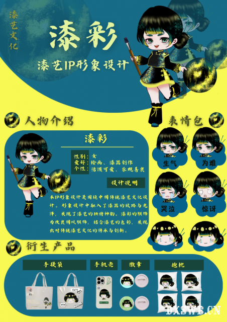 在“漆彩”IP形象设计完成后,实践团进一步结合互联网表情包等流行元素,设计并推出了六款“漆彩”表情包和一系列IP衍生品。这些创意作品不仅丰富了“漆彩”IP的表现形式,也为推广“漆彩耀西江”城市品牌提供了有力支持。通过这些创新举措,实践团致力于将传统漆艺文化中的精髓和特色传递给现代社会,促进漆艺文化的传承与发展,同时也为白坭镇的文创产业注入新的活力,推动产业的繁荣发展。