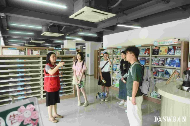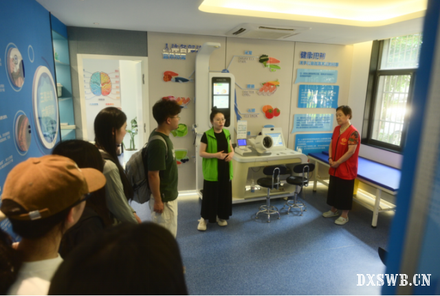 随后,实践团参观了永联爱心互助街。全长约300米的互助街上,图书馆、服务大厅、健康小屋、残疾人之家、家事调解工作室等服务场所和平台一应俱全,全方位提供政务、文化、体育、健康、教育等服务,让广大居民群众公平共享村、镇的发展成果。这是永联的“发展成果共享”理念的集中体现。