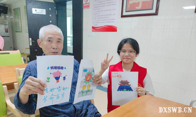 午后,实践队员们为老人们呈上了一场极具创意且充满欢乐的活动,教老人们为简笔画上色。实践队员们满心温柔与关爱,将一盒盒五彩斑斓的画笔递至老人手中。老人们的眼中闪烁着好奇与期待的光芒,仿佛瞬间变回了充满探索欲望的孩童。在队员们的悉心指引下,老人们轻轻地拿起画笔,精心挑选着颜色。他们有的为娇艳的花朵涂抹上绚丽的色彩,令春天在画纸上绚丽绽放;有的为雄伟的天安门城楼赋予庄严辉煌的色调,晕染出其宏伟的气势,展现出其不朽的魅力。每一笔、每一划,都饱含着专注与认真。欢声笑语在房间中悠悠回荡,一幅幅色彩明艳的画作渐次成形。这些作品绝非单纯的涂色之作,而是老人们内心世界的生动展现,是他们对生活的炽热热爱与美好憧憬。
