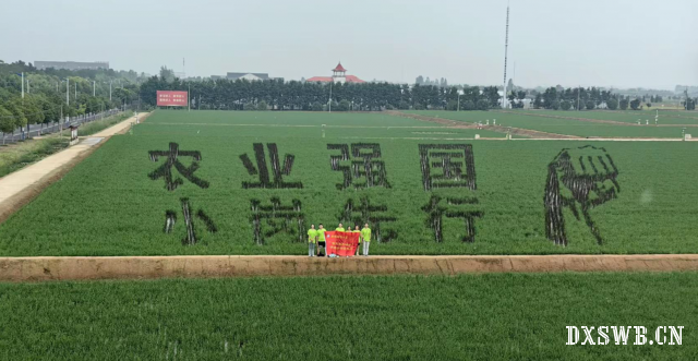 站上村头观光塔俯瞰,实践队员们看到一望无际的绿色稻田间,稻浪翻滚,满目块状的稻田,组合成不同的形状,一望无垠,蓝天白云下一片碧绿,“乡村振兴,小岗先行”的巨幅稻田画映入眼帘,异色水稻排布出的横竖撇捺,看着小岗村的现实发展,实践队员们不仅感慨中国改革开放的进程之快、之稳。