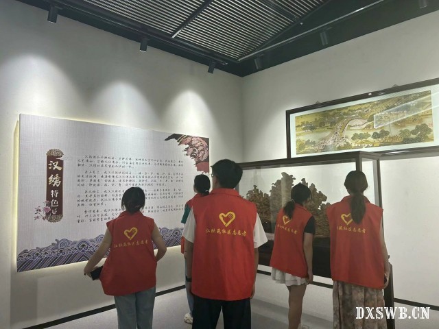 志愿服务队的成员们身着统一的服装,带着对传统文化的敬畏之心缓缓步入这艺术的殿堂。他们或驻足凝视,仔细品味每一幅作品的独特韵味;或轻声讨论,交流着对汉绣技艺的见解与感悟。此次参观不仅让志愿者们近距离感受到了汉绣的无穷魅力,更激发了他们对传统文化的浓厚兴趣和保护传承的使命感。