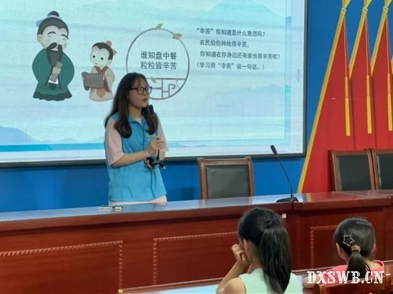 活动通过授课展开,团队成员胡诗瑶、单雨萱两位同学以PPT的形式,分别通过古诗和名人事迹给孩子们讲解节约粮食的重要性。