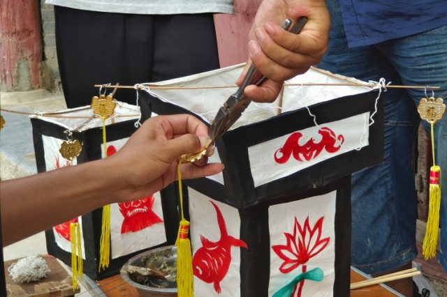 实践团成员对制作完成的宫灯进行修饰 吴雅美摄