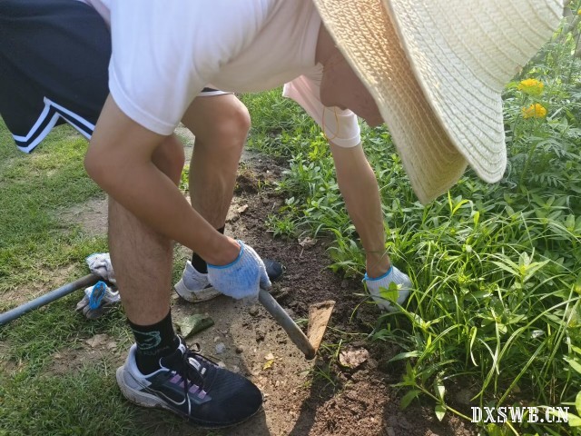 图为实践团队成员使用锄头对花坛周围的杂草进行清除 孙浩琪/供图