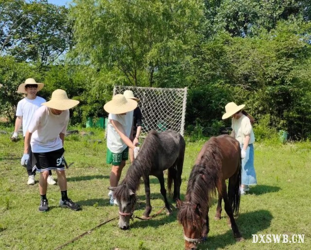 图为实践团队成员们正在对矮马进食区域打扫和清理 孙浩琪/供图