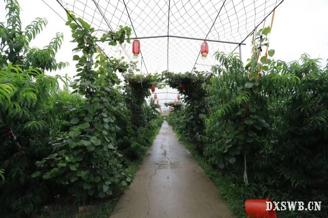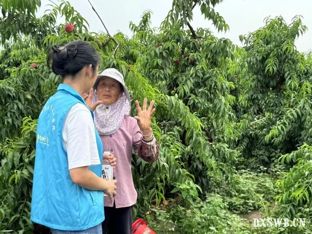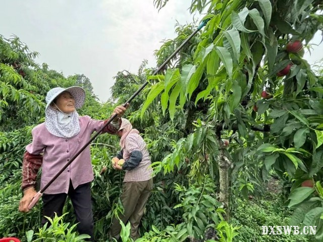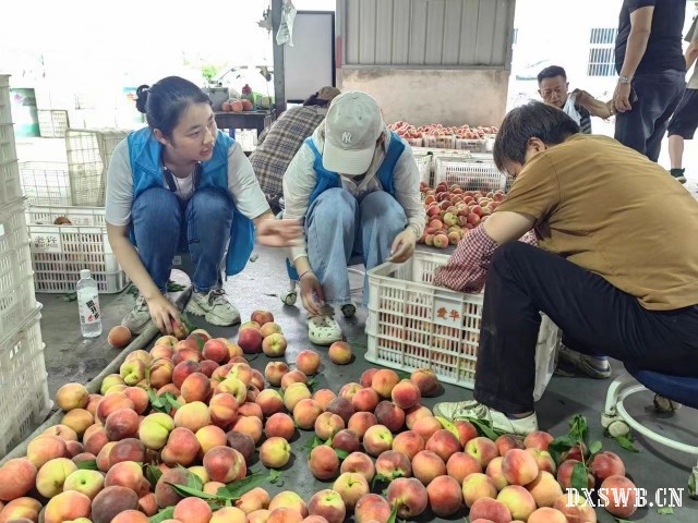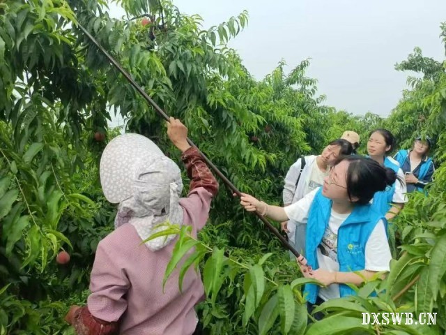 走进合作社,首先看到的是一个小型的桃子加工驿站,里面的工作人员人正忙碌着将新鲜采摘的桃子去叶子装进篮框里,运往外面进行售卖。往里面走,映入眼帘的是一条笔直的水泥路,水泥路的两旁都是一个个别有洞天的桃子种植区,每一个区域都能看见一些农民奶奶在忙碌,为了深入了解果园运作机制,社会实践团队成员走进不同的区进行询问和体验摘桃技术,奶奶们都十分热情,告诉我们桃子的生长环境和规律,一口亲切的方言让团队成员们开怀大笑,还手把手教我们拿着长长的杆柄摘桃子,杆子拿在手里很难控制方向,刚开始桃子经常掉地,后来慢慢熟练了起来,奶奶们还热情的给我们剥桃子吃,桃子口感绵密,水润可口,十分美味。