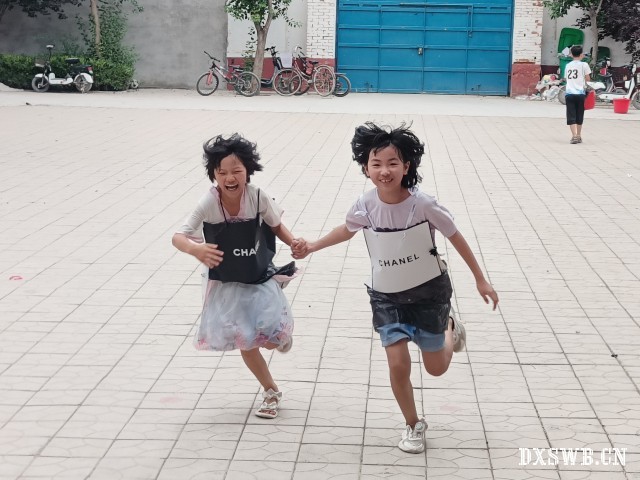 图为孩子们穿着自己制作的衣服奔跑
