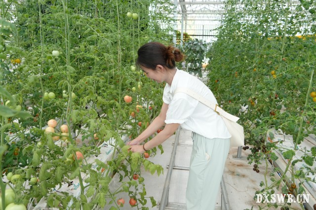 农业基地,是科技对乡村发展带来的变化之一。为了了高扬村的农业科技发展变化并用镜头记录下来,7月9日上午,扬州组实践团队成员来到了吴桥农业产业园区展示棚进行参观。产业园的工作人员主动为团队成员们讲解,向成员们介绍了蔬菜大棚里面主要的各种无土栽培的类型。翠绿的蔬菜生长在A字形循环栽培架上,十余种番茄在人工智能调控的适宜温度下长势正好。实践团队成员在工作人员的热情邀请下,当场试吃了几个刚刚成熟的番茄汁水很多,风味独特。