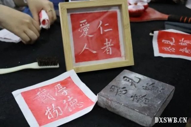 接下来,在老师的指导下,学生们亲身动手体验传拓技艺,追溯六艺文化。拓印讲究“笔墨精神、象物微妙”。经过老师讲解,学生们纷纷取一张宣纸,轻敷于凹凸器物的表面,浸湿打实,用墨捶印,制成拓片,晾干装裱。每一个环节都要丝丝入扣,层层相接。此次体验也加深了学生们对金石传拓这项传统技艺的了解和热爱,深刻体悟到了非遗魅力,传承千年文化之美。