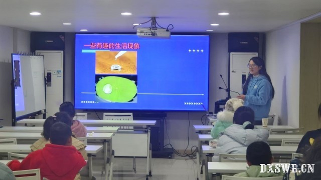 12月15日,武汉理工大学材料示范学院(微电子学院)微光服务队的队员们来到洪山区幸福社区,为社区的孩子们带来了一堂别开生面的科学小课堂——“如何玩转水的薄膜:水的表面张力实验课”。活动现场,孩子们的眼中充满了好奇与期待。主讲老师刘嘉慧首先通过简单易懂的语言向小朋友们介绍了什么是水的表面张力。“同学们,你们看,水的表面好像有一层‘膜’,这就是水的表面张力啦!”为了让抽象的概念具像化,队员们带领同学们进行了一系列有趣的实验。