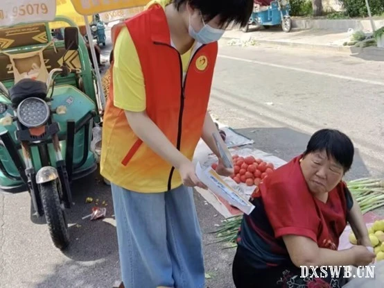 身穿志愿者马甲的人正在与一位路边摊的商贩交谈。这位穿着红黄相间背心的年轻人正在向那位坐在地上售卖水果和蔬菜的老年妇女解释一些信息。他们正在进行有关于法规或政策方面的宣传活动,它涉及到如何合法经营街头商贩业务、遵守卫生标准以及其他相关的法律法规等话题。这样的互动有助于增强市民对于这些重要问题的理解并促进社会和谐发展。