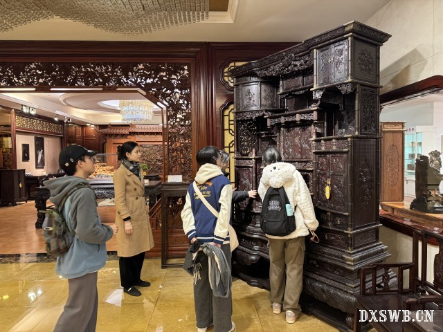 1月13日下午,实践队走进了木上红木展厅主馆。馆内展品丰富多元,令人目不暇接。不同风格流派的红木家具展厅依次排开,陈列着诸多融合传统与现代设计理念的红木佳作,既保留了古韵,又展现出时尚气息。更有大师级别的木雕艺术珍品,每一刀刻痕都诉说着匠人的非凡技艺。