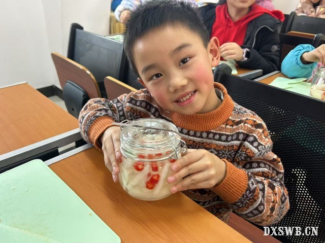 “一洗,一削,一切,一放”,孩子们每个环节都细致认真。即使他们的动作不太熟练,但都非常愿意尝试,一个个萝卜粒切的有模有样。萝卜切好之后,就开始往密封罐里加盐,抓拌均匀并放入密封罐腌制。腌好后往里面加醋、小米椒、冰糖,腌制一个晚上的时间,酸甜可口的腌萝卜就制作完成了。瞧!孩子们看着自己亲手做的萝卜,口水都要流出来了。
