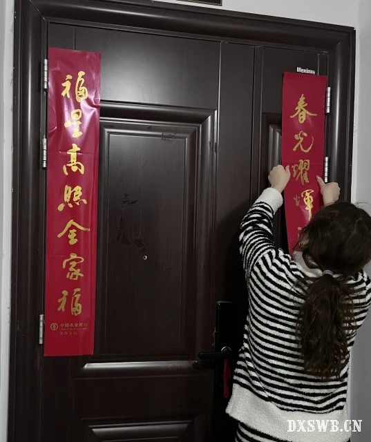 除夕当天,实践团成员索诗奇深入焦作当地社区,与居民们一起体验了贴春联的传统习俗。在焦作,贴春联是除夕的重要活动之一,象征着辞旧迎新、祈福纳祥。索诗奇在社区居民的指导下,将其张贴在大门上。她小心翼翼地展开一幅幅大红的春联,仔细地涂抹着糨糊,随后将春联张贴在门楣之上。每一张金黄的福字、每一副对仗工整的春联,都饱含着对新一年的美好期许。在张贴过程中,索诗奇与居民们热情交流,从春联的字词含义到书写笔法,再到背后所蕴含的驱邪祈福等文化内涵和历史渊源,居民们毫无保留地分享着自己的知识与故事,她也听得津津有味,不时提出疑问,现场气氛热烈而融洽。