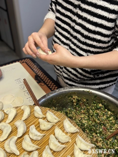 除了贴春联,包饺子也是春节期间必不可少的传统习俗。在除夕和大年初一,实践团成员索诗奇受邀来到当地居民家中,一同围坐在温暖的餐桌旁,开启了一场欢乐的包饺子之旅。一开始,她对擀皮和包饺子的技巧并不熟练,包出的饺子形状各异,引得大家阵阵欢笑。但在居民们耐心细致的指导下,她逐渐掌握了要领,擀出的面皮越来越圆,包出的饺子也越来越有模有样。大家一边包饺子,一边唠着家常,从春节的习俗聊到日常生活的趣事。饺子,作为春节餐桌上的传统美食,不仅仅是一种食物,更是团圆和幸福的象征。实践团成员索诗奇通过亲手包饺子,不仅品尝到了美味的饺子,更真切地感受到了浓浓的年味和家庭的温暖。在包饺子的过程中,她还了解到焦作独特的习俗:在其中一个饺子里包上硬币,谁吃到这个饺子,谁就将在新的一年里承接好运。