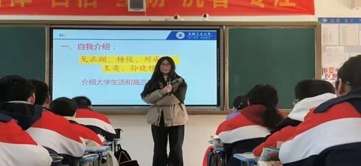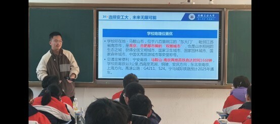 随后由实践队员为大家分享自己的高三经历,学习心得,心理情感。最后由戈正翔同学为同学们详细地进行安工大的宣讲,戈正翔分别从工大位置、工大学习、工大专业、工大生活、工大未来等方面为大家介绍安工大,面对戈正翔同学细致简洁地讲解从未有过大学经历的同学们却都能沉静置身于安工大的生活中被戈正翔同幽默的语言与安工大的特色吸引住了,随着戈正翔同学的宣讲结束,这次活动也接近尾声同学们以热烈的掌声欢送他们的离开。