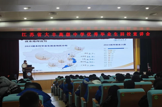 2025年1月20日,江苏省盐城市大丰区——今日,河海大学“源泉工程”宣讲团走进大丰第一高级中学,开展了一场主题鲜明、内容丰富的宣讲活动。此次活动旨在向母校学子全面介绍河海大学的办学特色、学科优势及校园文化,激励更多优秀学子报考河海,为国家水利事业和经济社会发展贡献力量。