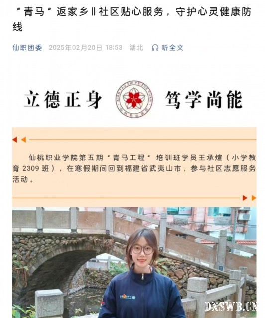 仙桃职业学院第五期“青马工程” 培训班学员王承煊(小学教育 2309 班),在寒假期间回到福建省武夷山市,参与社区志愿服务活动。