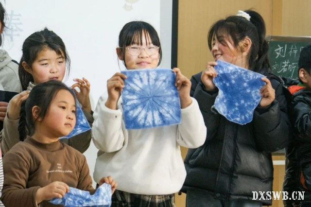 支教队邸梦涵为当地孩子带来一场“传承非遗,布里生花”扎染课。课程开启,邸梦涵先展示多幅精美扎染作品,随后,她详细介绍扎染历史渊源与文化内涵,让孩子们领略非遗魅力。实操教学时,邸梦涵展示夹扎、捆扎等技法,鼓励大家发挥想象、大胆创作。课程尾声,孩子们踊跃展示作品,分享创作灵感。这堂课是一次手工教学,更是一次非遗文化传承的生动实践,为乡村教育注入新活力,推动非遗文化薪火相传。