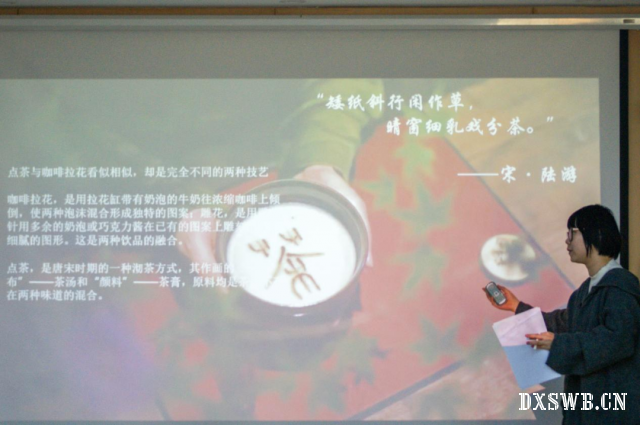 支教队李屹佳精心设计《宋代点茶》课程,带同学们走进宋朝的茶香世界,感受古人风雅,领略茶道魅力。以生活中更常见的咖啡拉花类比引入,从点茶的历史起源讲起,李屹佳深入解析其与唐代煎茶的渊源,细述宋代茶的形态与保存方式。课程重点介绍点茶的工具与步骤,从炙茶、碎茶到七汤点茶法,每一步都蕴含着古人智慧。更有视频演示,让学生直观感受点茶之美,让传统文化在现代社会焕发生机。