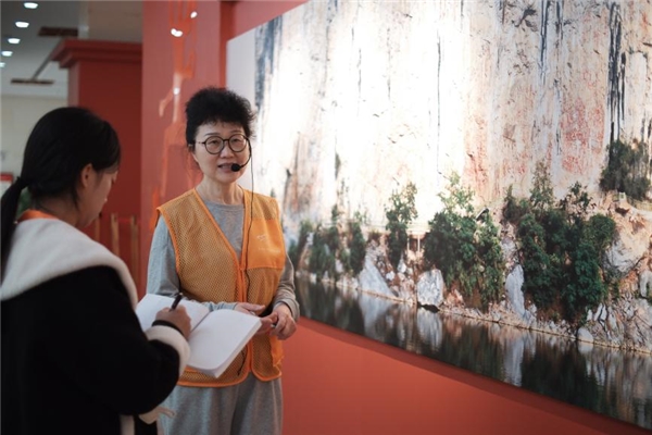 图为广西民族博物馆讲解员在介绍花山岩画作画内容