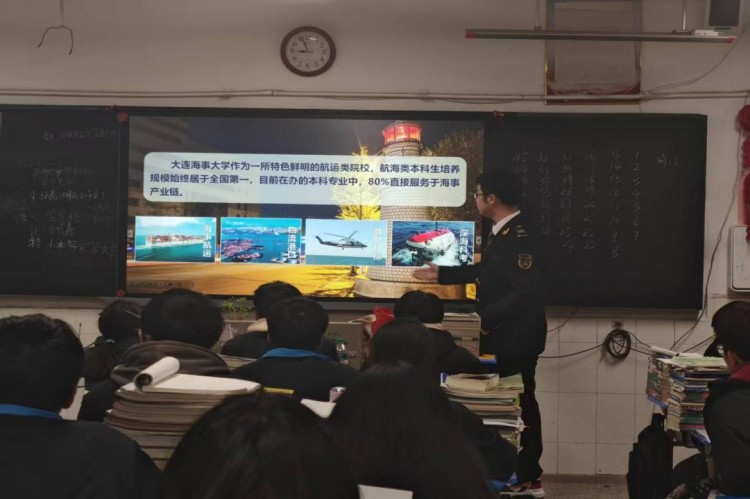 在分宜中学的首场活动中,团队成员身着海员制服,结合大连海事大学的办学历史、学科优势、就业前景等内容展开宣讲。宣讲人王宇曦通过分享在校学习经历,生动展现了航海类院校的特色和校园文化。活动现场还发放了《大连海事大学报考指南》及校园明信片,帮助高三学生深入了解该校招生政策。
