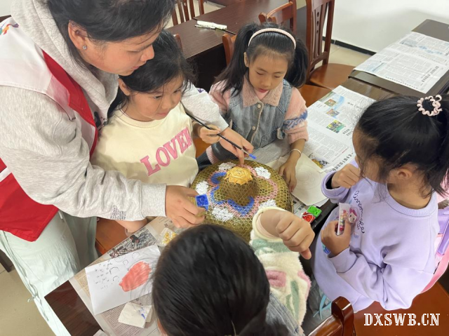 船上的生活总是与阴晴不定的天气相伴,这时疍家帽便现身为渔民遮风挡雨,其实用功能背后,还蕴藏着疍家渔民们浓厚的生活情怀和质朴的审美意趣。1月23日,“青衿渔火”队带领社区少年们热闹开展“一双小巧手,装扮疍家帽”的趣味活动,少年们纷纷拿起颜料、珍珠、画笔和胶水等工具,在一顶顶疍家帽上精心晕染出创意的图案,感受疍家渔民在风雨飘摇中表达出来的乐观与坚韧,进而对自己未来的学习生活充满勇气和力量。