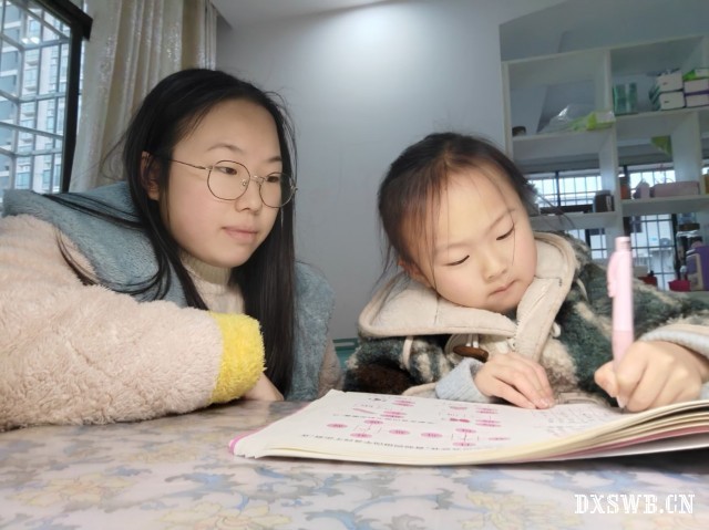 图为志愿者在辅导小朋友寒假作业。丁涵 供图