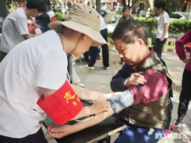 图为志愿者为社区居民测量血压