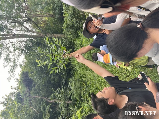 交流互动环节,两名队员手持植物样本与老师共同展示,围绕植物特性、生态作用展开讨论,其他队员拍照记录、补充观点,现场互动频繁,深化了知识理解与团队协作能力。
