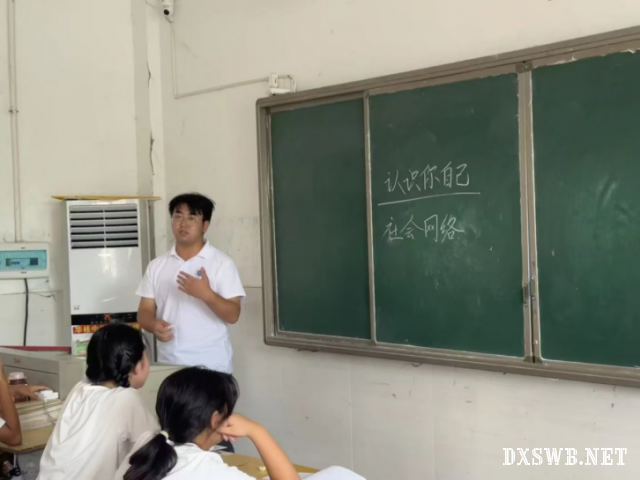 图片为湖北师范大学历史文化学院“爱童行”实践队成员吕鑫在给学生上心理课"认识自己"(大学生网报通讯员刘欣阳摄)