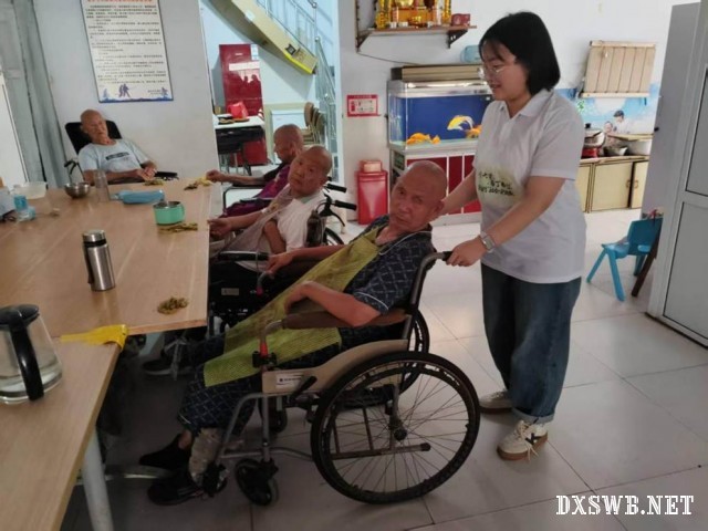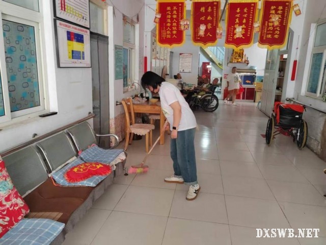 与老人们交流结束后恰逢养老院自由活动时间,团队成员看到那些坐着轮椅行动不便的老人在餐桌旁不能移动,便主动上前询问了老人的需求,推动轮椅带老人回了房间,还细心地为老人检查了轮椅安全带。在随后的打扫卫生环节,团队队员仔细清扫了地面,为老人们营造了一个更加干净整洁的环境,还特地细致清扫了老人们的日常互动区域,防止老人们在活动时跌倒,用自己的实际行动践行了孝道。