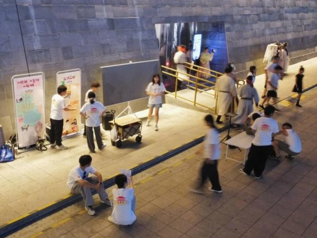活动于八点三十分应天门广场灯光秀结束后正式开始。实践队员们分工协作、迅速投入。一组队员利用投影设备,在应天门遗址博物馆出口处播放精心制作的调研成果短片和图片集,生动呈现了丝路驼铃的悠远、黄河奔流的壮阔以及当代保护实践,吸引了大批游客驻足观看。部分队员对往来游客进行问卷调查。调查显示,参与游客来自北京、天津、重庆、甘肃、陕西、浙江、新疆等地,涵盖祖国大江南北,年龄层则自6岁至70岁以上,覆盖面极广。其余队员手持宣传资料,结合自身历史、考古、旅游管理等专业知识,热情洋溢地对游客进行“小范围”“一对一”的知识讲解。