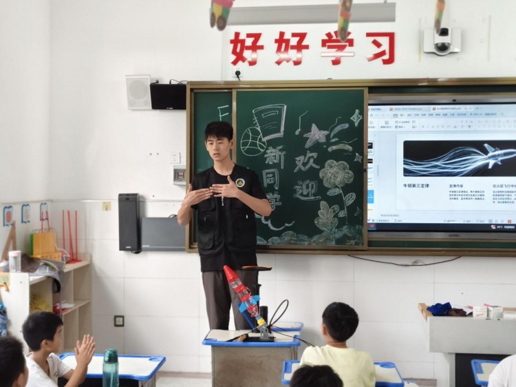 课程伊始,实践队队员以生动的提问切入:“大家知道火箭是如何飞向太空的吗?”引发孩子们的热烈讨论。随后,队员们通过动画演示和通俗讲解,介绍了反冲力、气压原理等水火箭升空的核心科学知识,并将抽象的物理概念转化为孩子们能理解的生活现象。通过讲解,孩子们从原本充满疑惑的小眼睛里渐渐闪烁出理解的光芒,大家都听得津津有味。