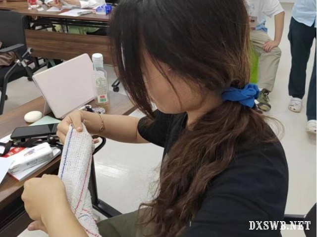 安全培训会分为线下+线上两部分,在线下实地操作演练中,团队成员王欣丫同学勇于尝试,在救护员指导下进行心肺复苏和包扎练习。她跪在模拟人身旁,手心下压, “成人按压深度五厘米,频率每分钟一百次以上……”她依言发力,手臂肌肉很快便酸麻如同坠铅,额上汗滴点点。三十次按压后,王欣丫同学抬头捏鼻、吹气,如此循环往复。她表示“原来生命托付于手的重量,竟也如此沉甸甸。”线上参与的同学安静聆听,同步学习。